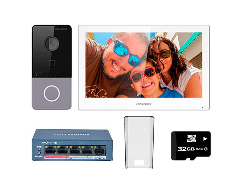 В комплекте: вызывная панель x1, внутренняя станция x1, коммутатор PoE x1, карта памяти TF на 32 ГБ x1