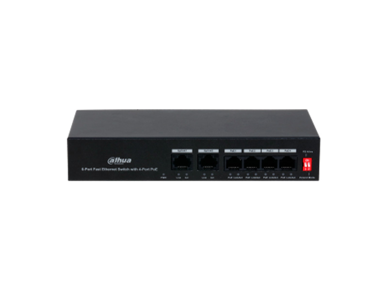 4 порта 10/100 Мбит/с с PoE, 2 порта uplink 10/100 Мбит/с