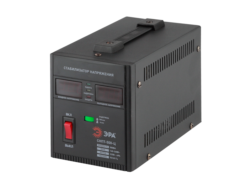 Переносной стабилизатор напряжения с LED-дисплеем, показывающим индикацию входного и выходного напряжения, а также индикацию режимов работы. Мощность - 500 ВА.
